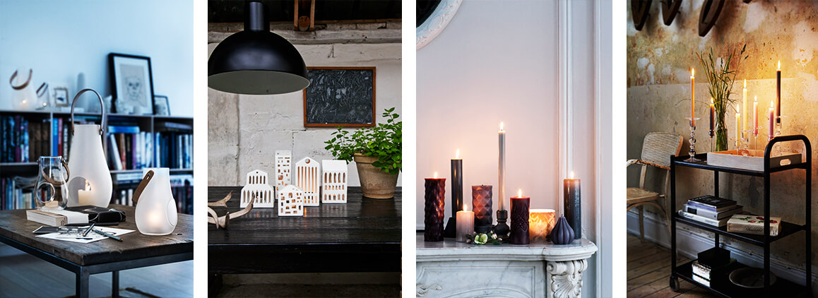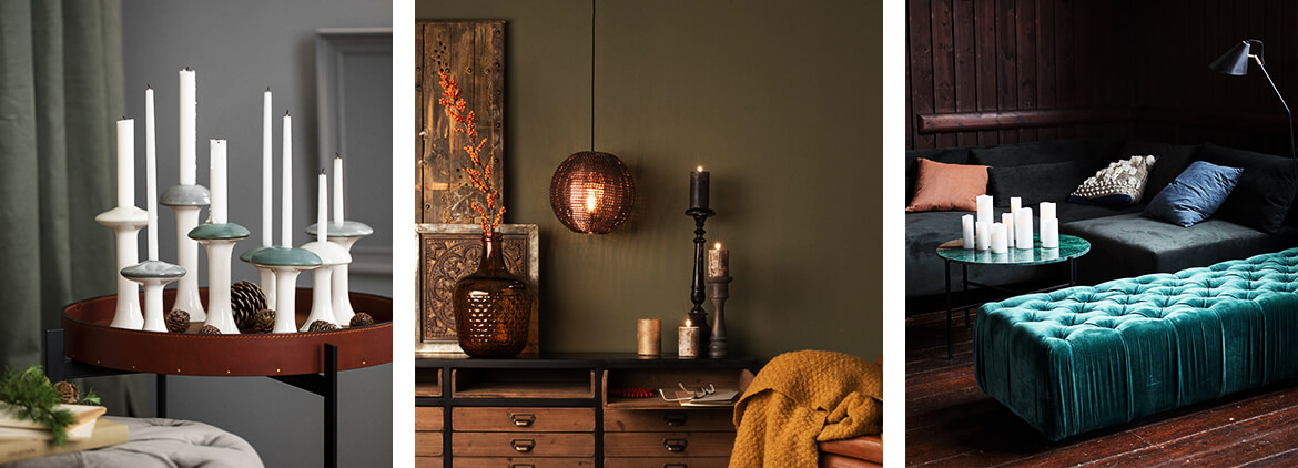 Pour les bougies et les sources lumineuses, en automne la règle est la suivante : plus il y en a, mieux c’est. Optez pour des bougies de la même couleur, de préférence dans des tons naturels de saison comme le bordeaux ou le bleu myrtille par exemple. Une alternative : les bougies blanches, un classique intemporel qui trouve leur place dans chaque foyer. Organisez-les en groupe et en nombre impair pour un rendu plus harmonieux.