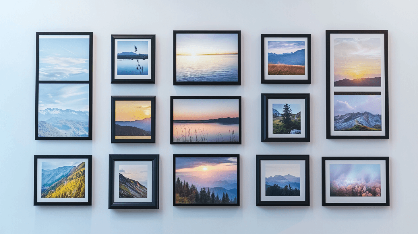Une disposition classique est la grille. Ici, les images sont accrochées à intervalles réguliers et de manière symétrique. Cette méthode est particulièrement adaptée aux photos dans des cadres et tailles uniformes, car elle transmet un sentiment d'ordre et de structure. Une disposition en grille peut être orientée aussi bien horizontalement que verticalement et est idéale pour les styles d'intérieur minimalistes.