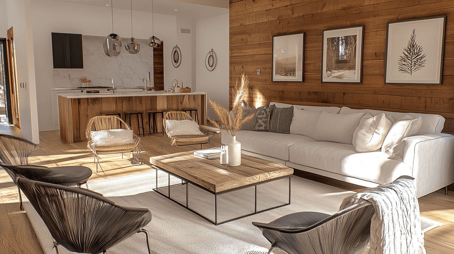 Le style Cabin Chic offre la possibilité d'intégrer des éléments modernes de manière harmonieuse, sans perdre le charme rustique. Commencez par choisir des meubles aux lignes épurées et au design minimaliste. Un canapé moderne dans une teinte neutre peut être complété par des accessoires rustiques comme des tables en bois ou des malles anciennes.